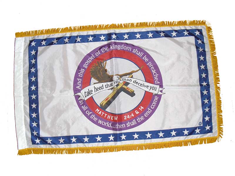 Constructed using 200 denier nylon, this single face reverse image is trimmed with gold fringe, and has a leather tab used to attach to staves. This is often used in parades or standing in a base inside of buildings. The gold toned fringe does not allow for outdoor wet weather. Shipped USPS Priority